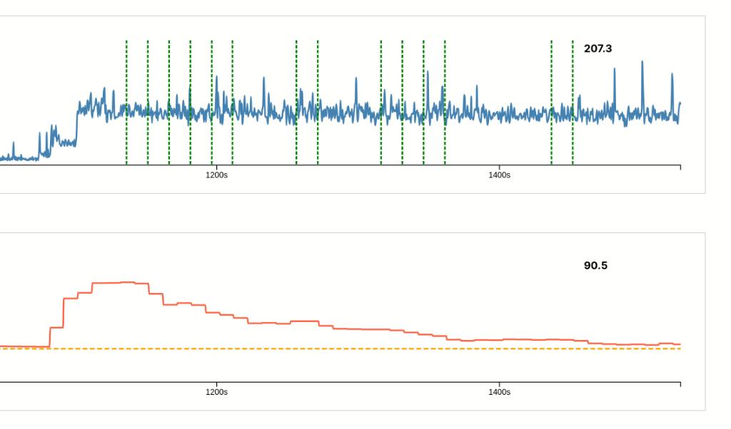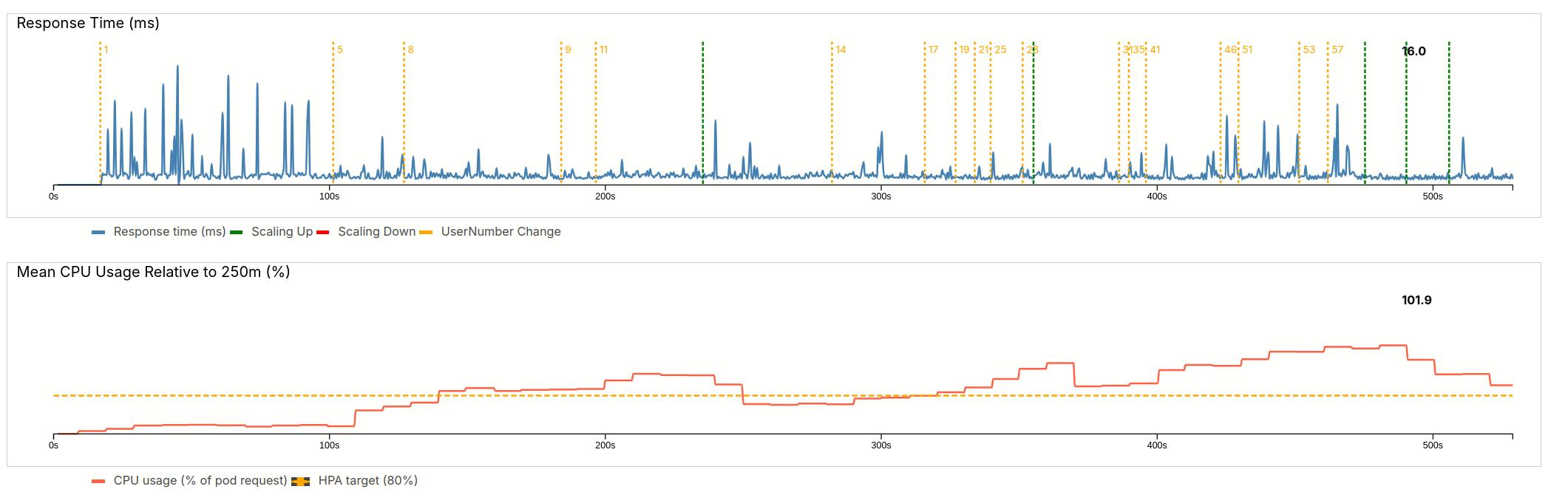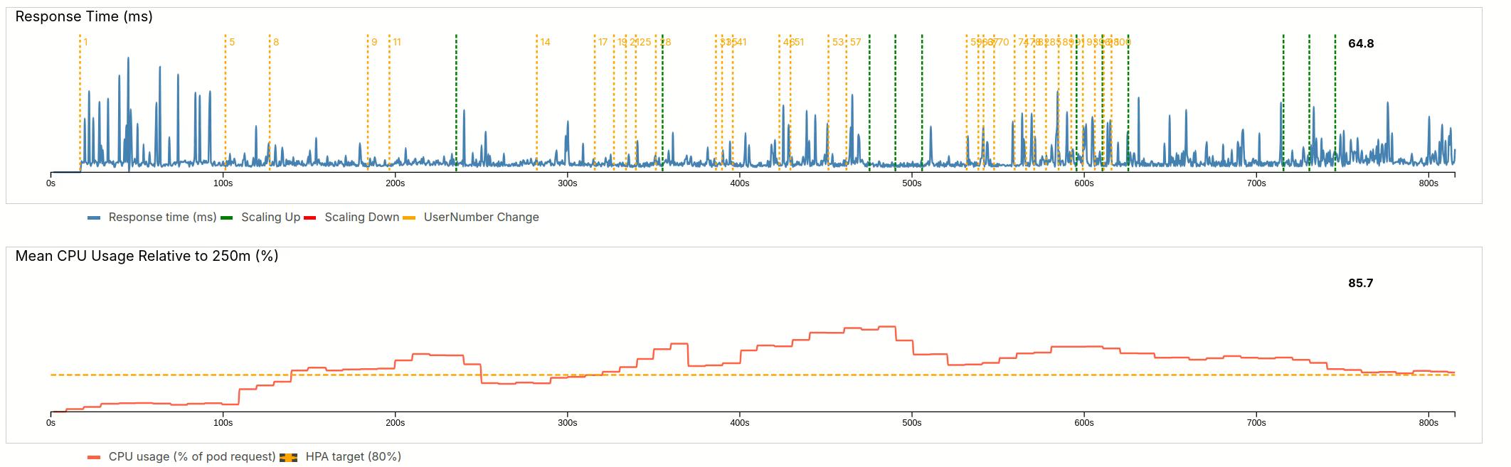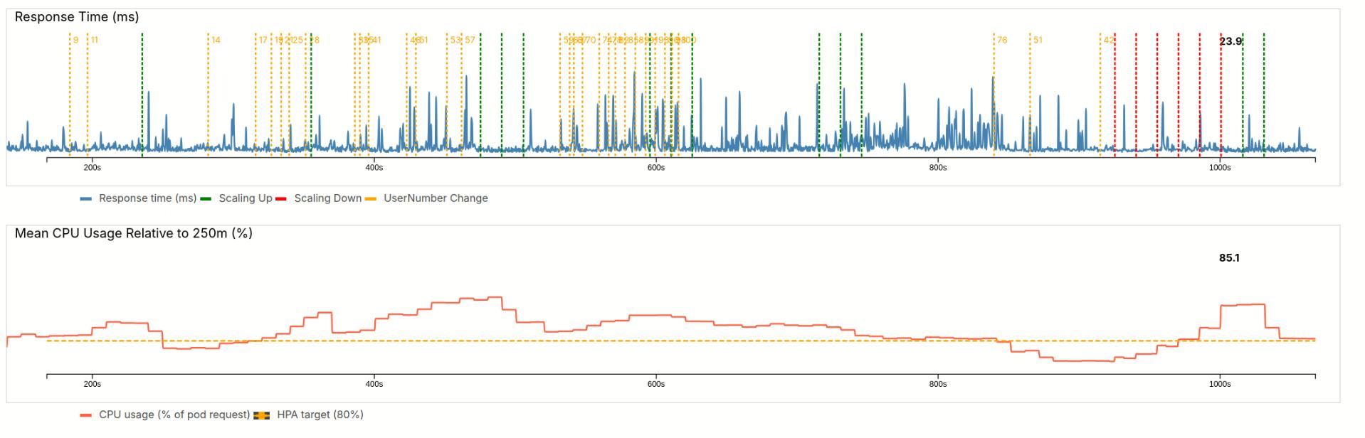 Kubernetes is configured in such a way, that it will increase the number of pods if CPU usage repeatedly exceeds 80%. For scaling up, a green line is plotted in the requests plot. A red line for downscaling.