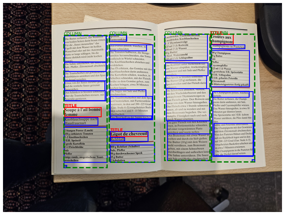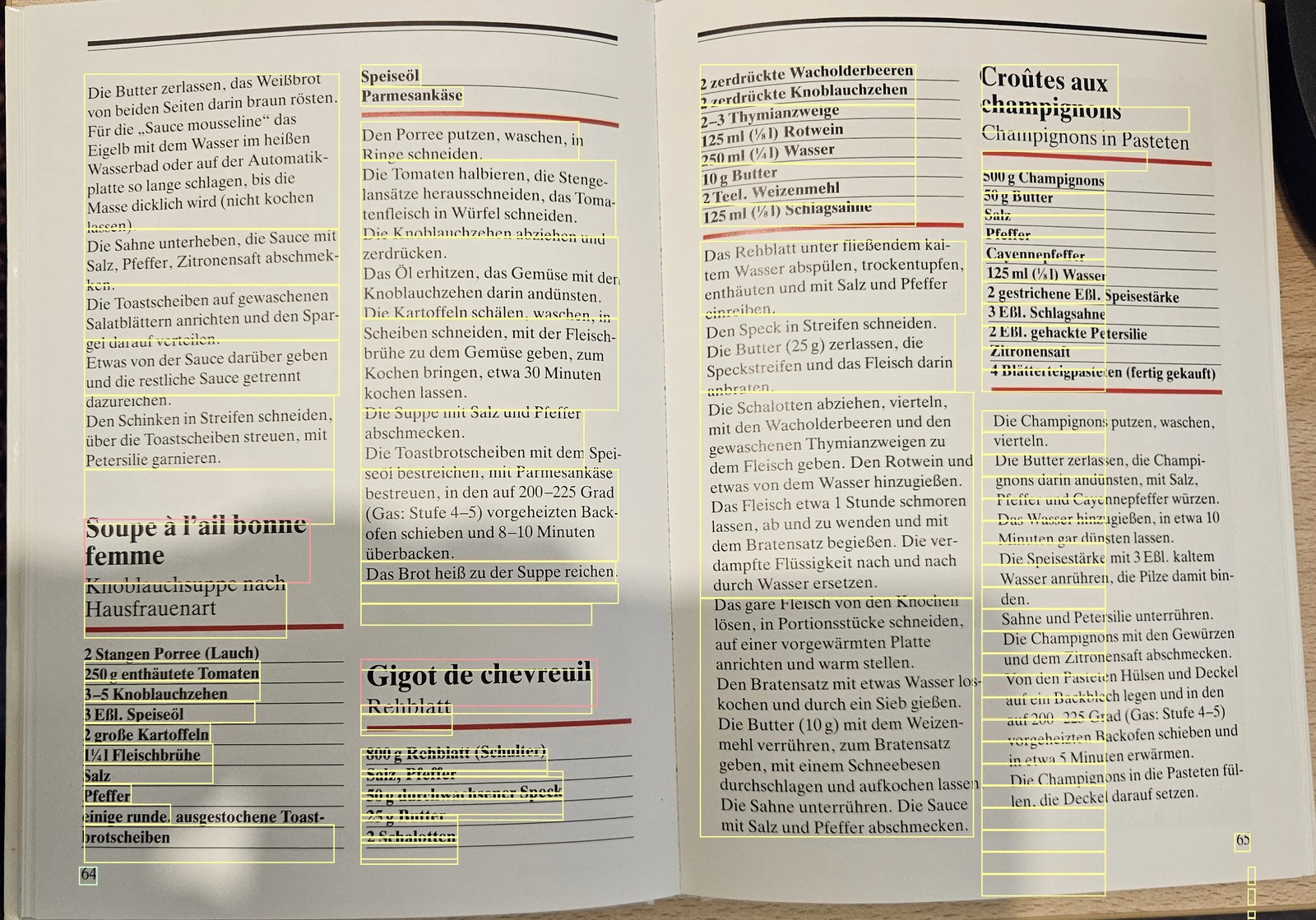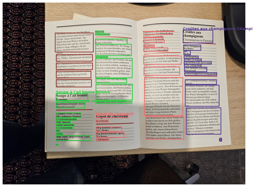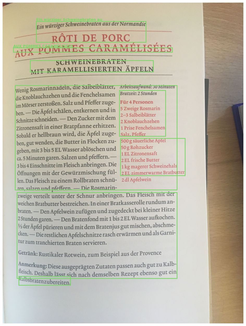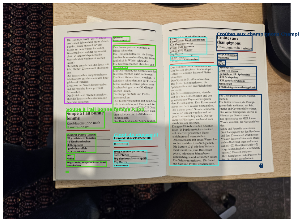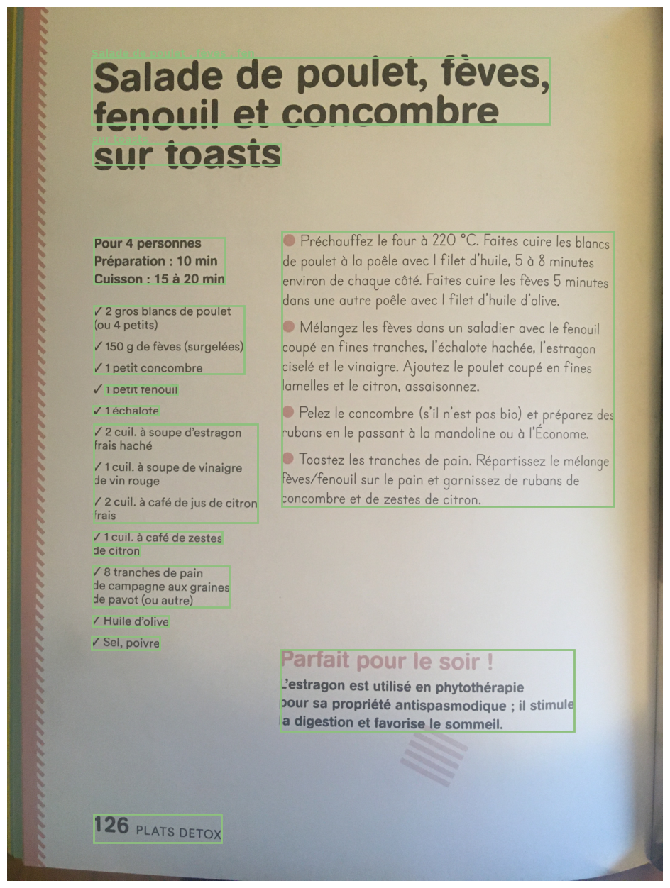 In both cases, we can see that the title detection is not optimal. In the case of the block-based detection it will be difficult to separate “Soupe à l’ail bonne femme Knoblauchsuppe nach”.