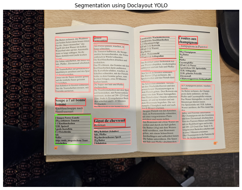 One such layout parser is the actual LayoutParser. It combines an automatic analysis of OCR output and segmentation. Unfortunately, the segmentation is done with detecron2. The active development seems to have stopped and it no longer works on my python installation (Python 3.12). My research revealed Python 3.9 as the last working version.