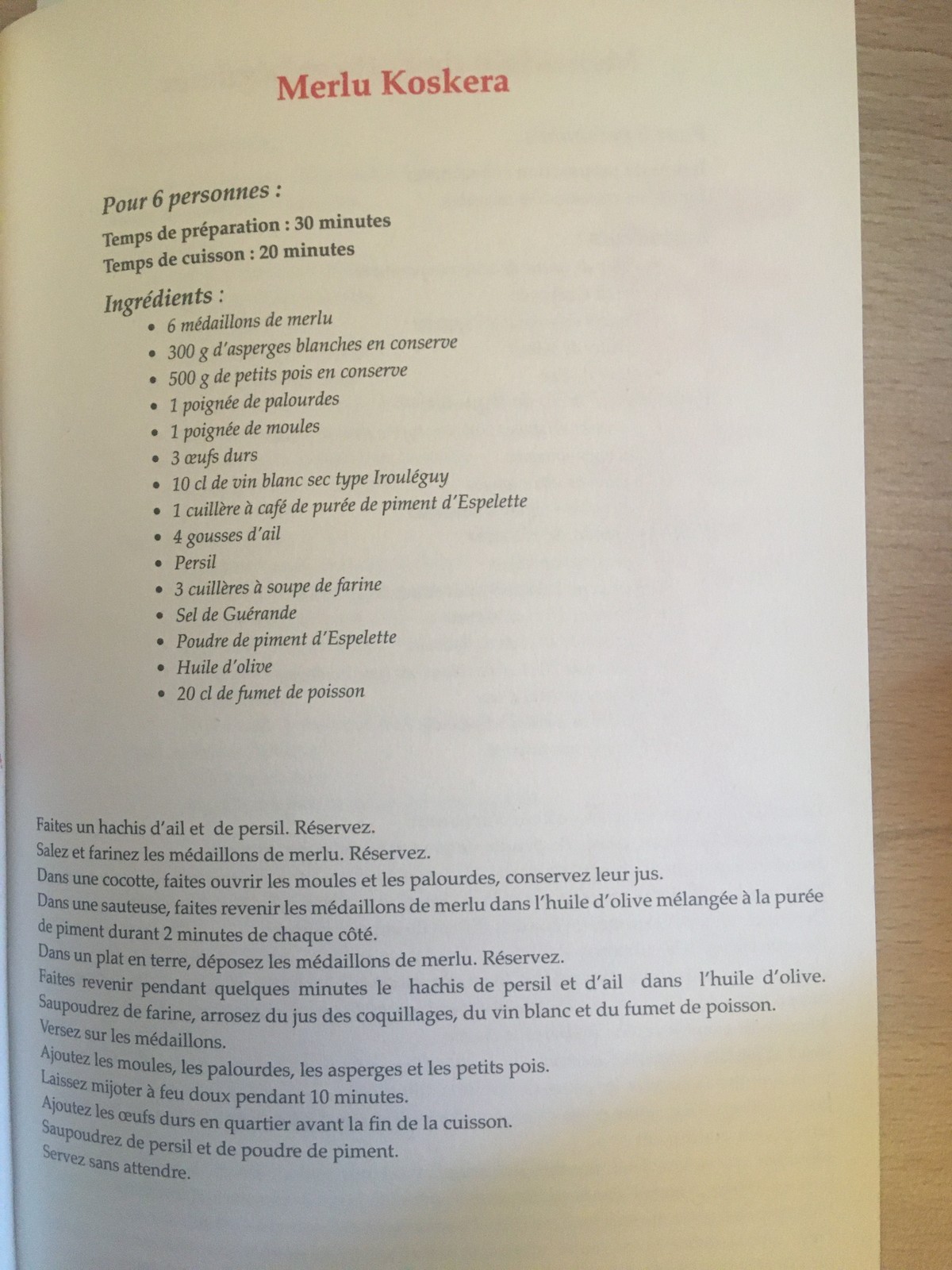 " 6 médaillons de merlu 300 g d'asperges blanches en conserve • 500 g de petits pois en conserve • 1 poignée de palourdes • 1 poignée de moules ⚫ 3 œufs durs • 10 cl de vin blanc sec type Irouléguy • 1 cuillère à café de purée de piment d'Espelette • 4 gousses d'ail • Persil • 3 cuillères à soupe de farine • Sel de Guérande • Poudre de piment d'Espelette • Huile d'olive • 20 cl de fumet de poisson"]}]