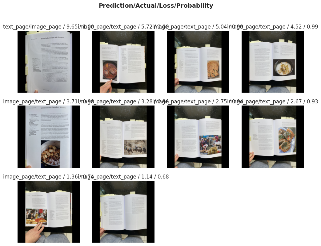 As expected, most of the top losses come from the new category in the validation set: text with big picture. Let’s try cropping instead of padding.