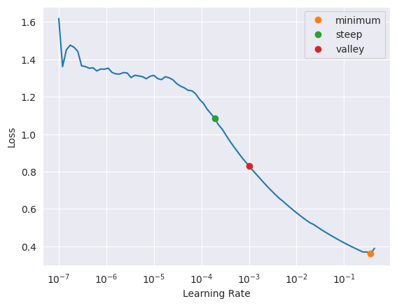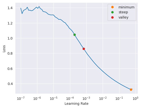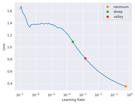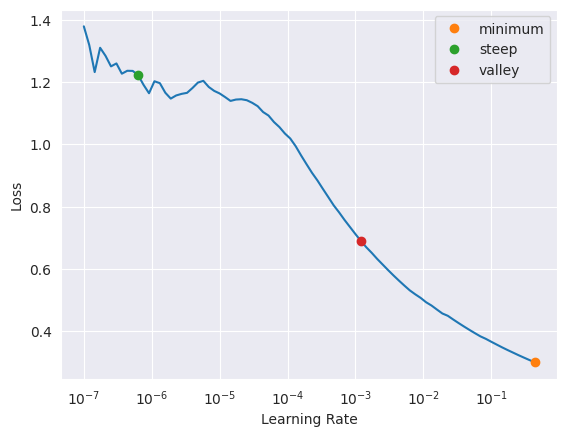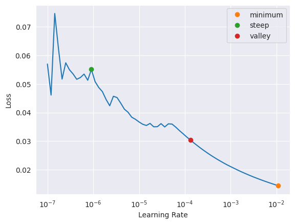 SuggestedLRs(minimum=0.04365158379077912, steep=6.309573450380412e-07, valley=0.0012022644514217973)