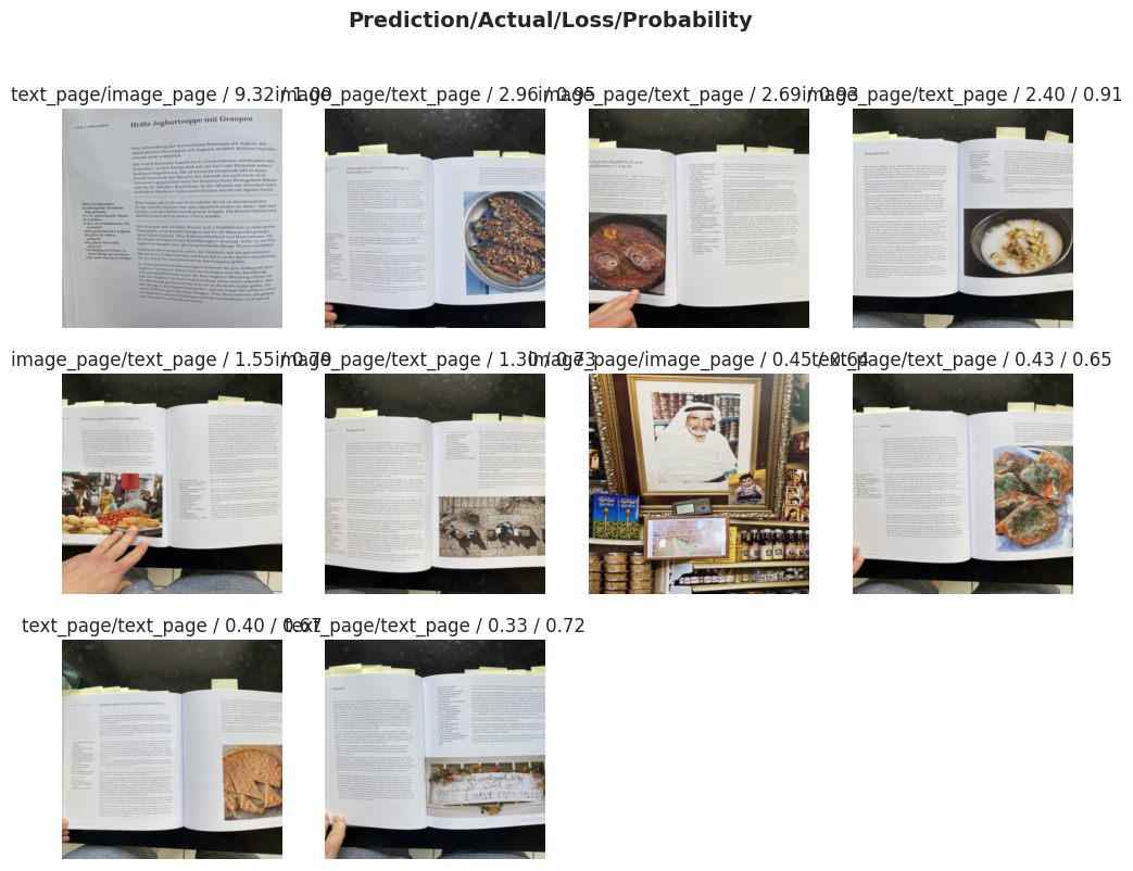 As expected, most of the top losses come from the new category in the validation set: text with big picture. Let’s try cropping instead of padding.